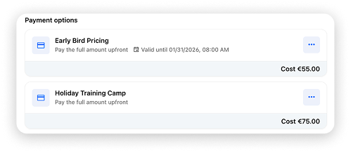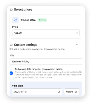 Du kan nu styra exakt när varje betalningsalternativ inom ett paket är tillgängligt genom att ange giltighetsdatum. Detta gör det enkelt att erbjuda förtidsrabatter, standardpriser eller sena anmälningsavgifter utan manuellt arbete eller dubbla paket.